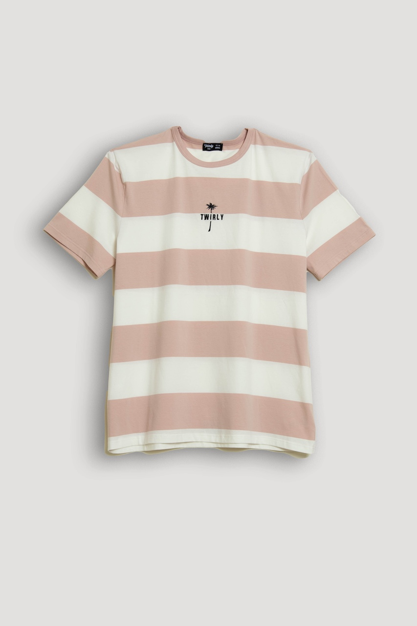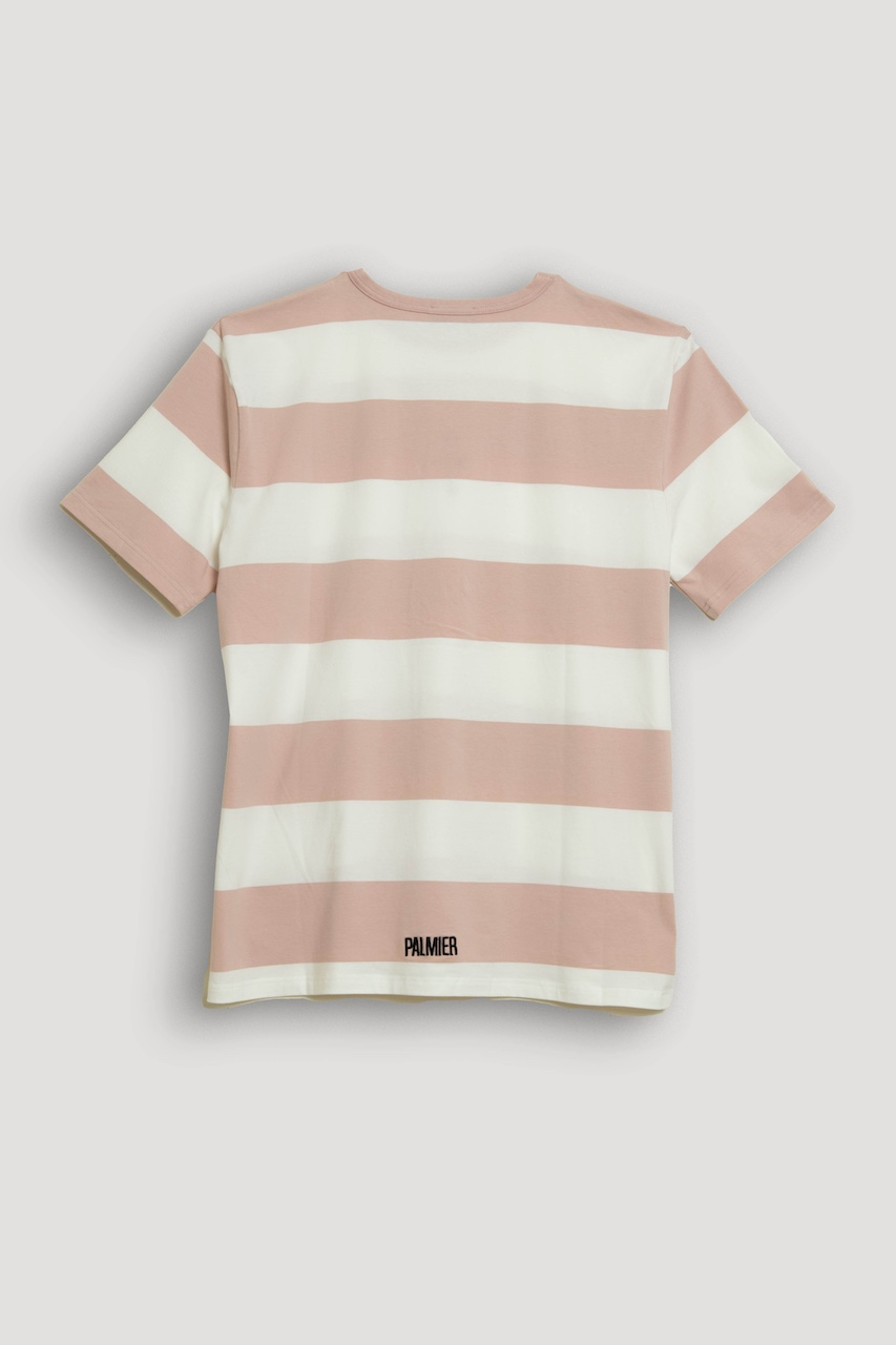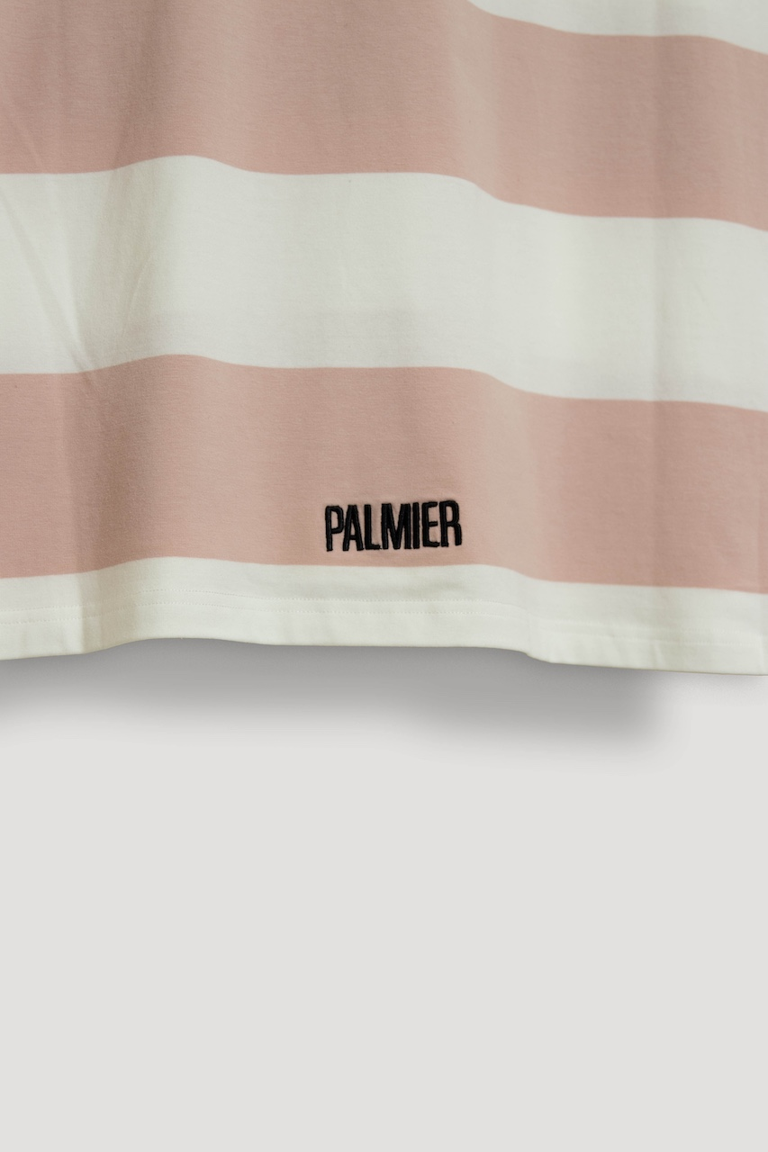 تي شيرت ملون مخطط مصنوع ليكون أوڤرسايز. شعار مطرز على الوسط الأمامي ومطرز PALMIER على الحافة السفلية الوسطى للتي شيرت